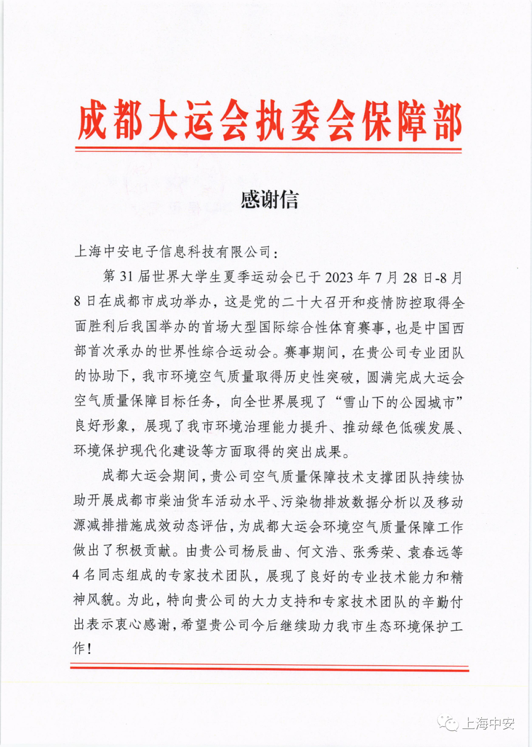 成都大運會執(zhí)委會保障部發(fā)來一封感謝信?。?023-10-15)